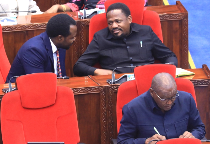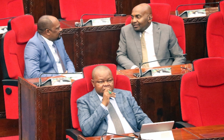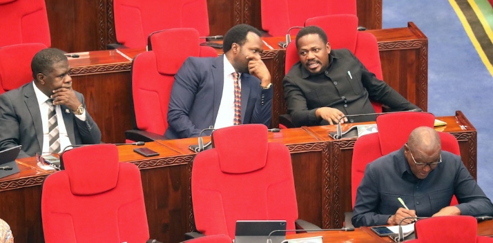 Naibu Waziri Ofisi ya Makamu wa Rais (Muungano na Mazingira) Mhe. Reuben Kwagilwa (kulia) akizungumza na Mbunge wa Nachingwea Mhe. Fadhili Liwaka wakati wa Kikao cha Saba cha Mkutano wa Tatu Bunge la 13 jijini Dodoma leo Aprili 13, 2026. Kushoto ni Naibu Waziri wa Fedha Mhe. Mhandisi Mshamu Munde na aliyekaa mbele ni Naibu Waziri wa Madini Mhe. Dkt. Steven Kiruswa.